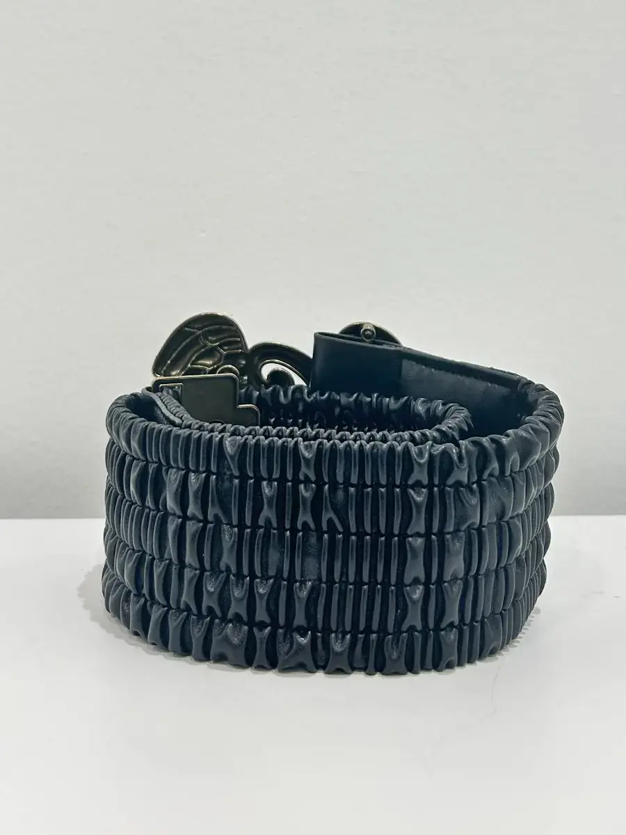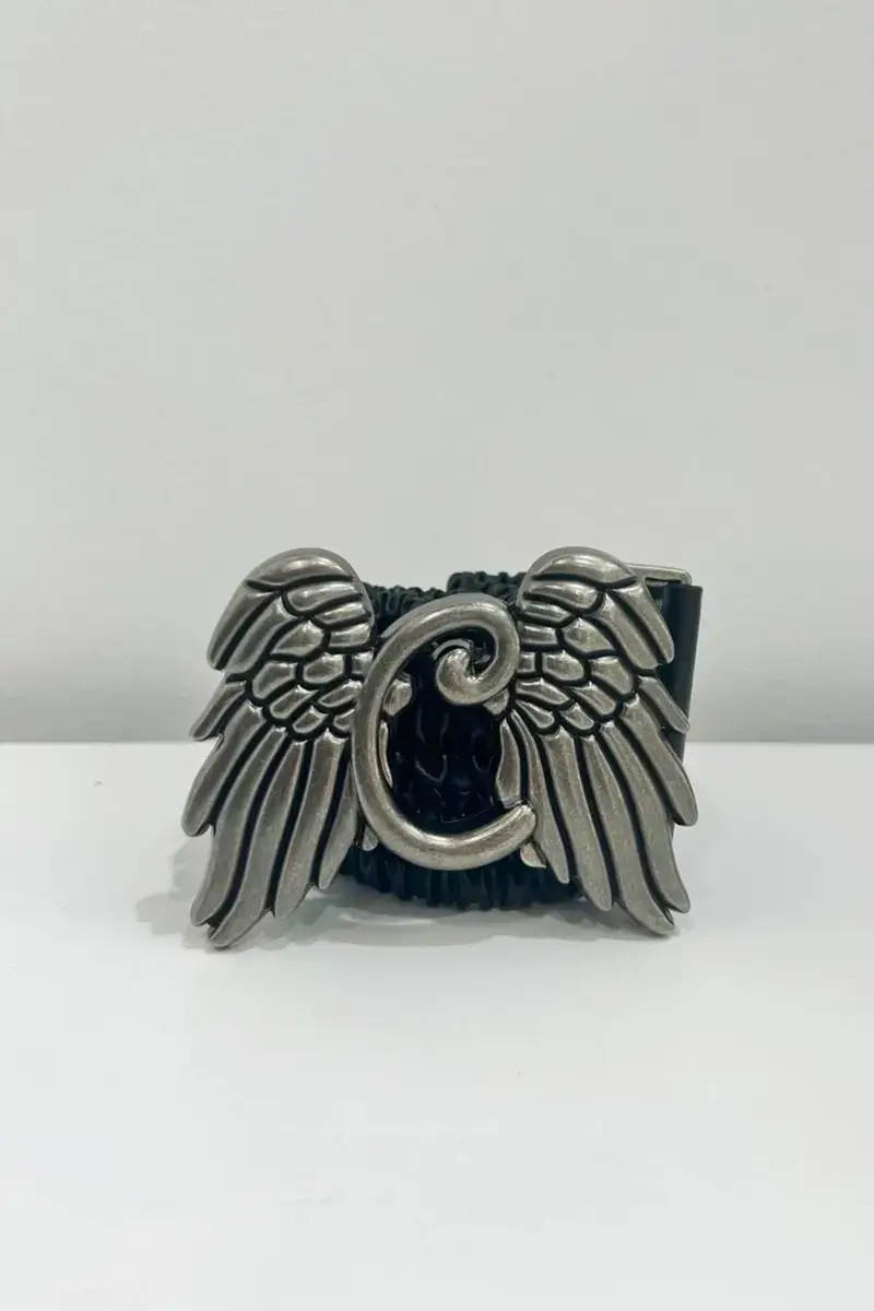 CINTURÓN ELASTICO NEGRO CON ALAS EN PLATEADO.