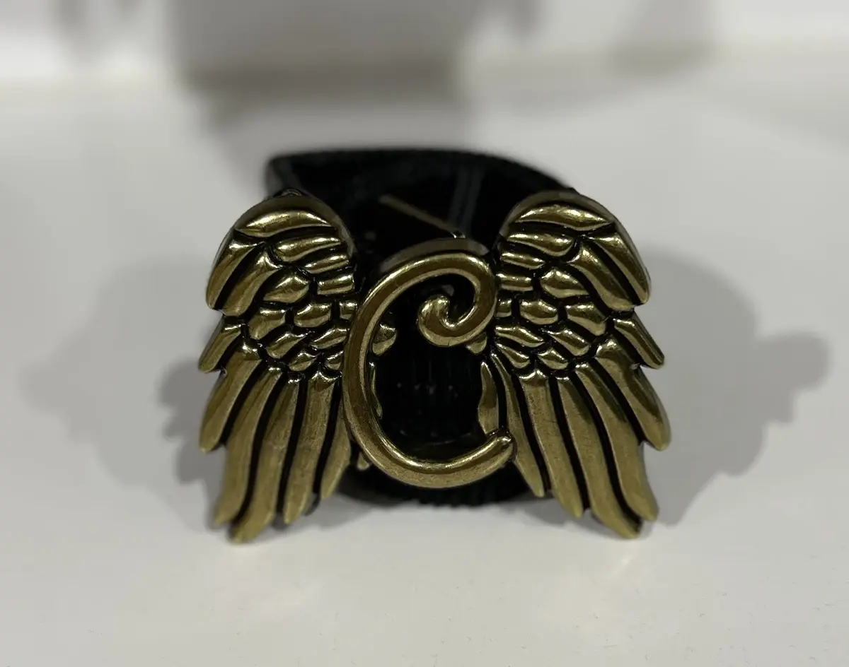 CINTURÓN ELÁSTICO NEGRO CON HEBILLA DORADA DE ALAS CAMALEÓNICA.
