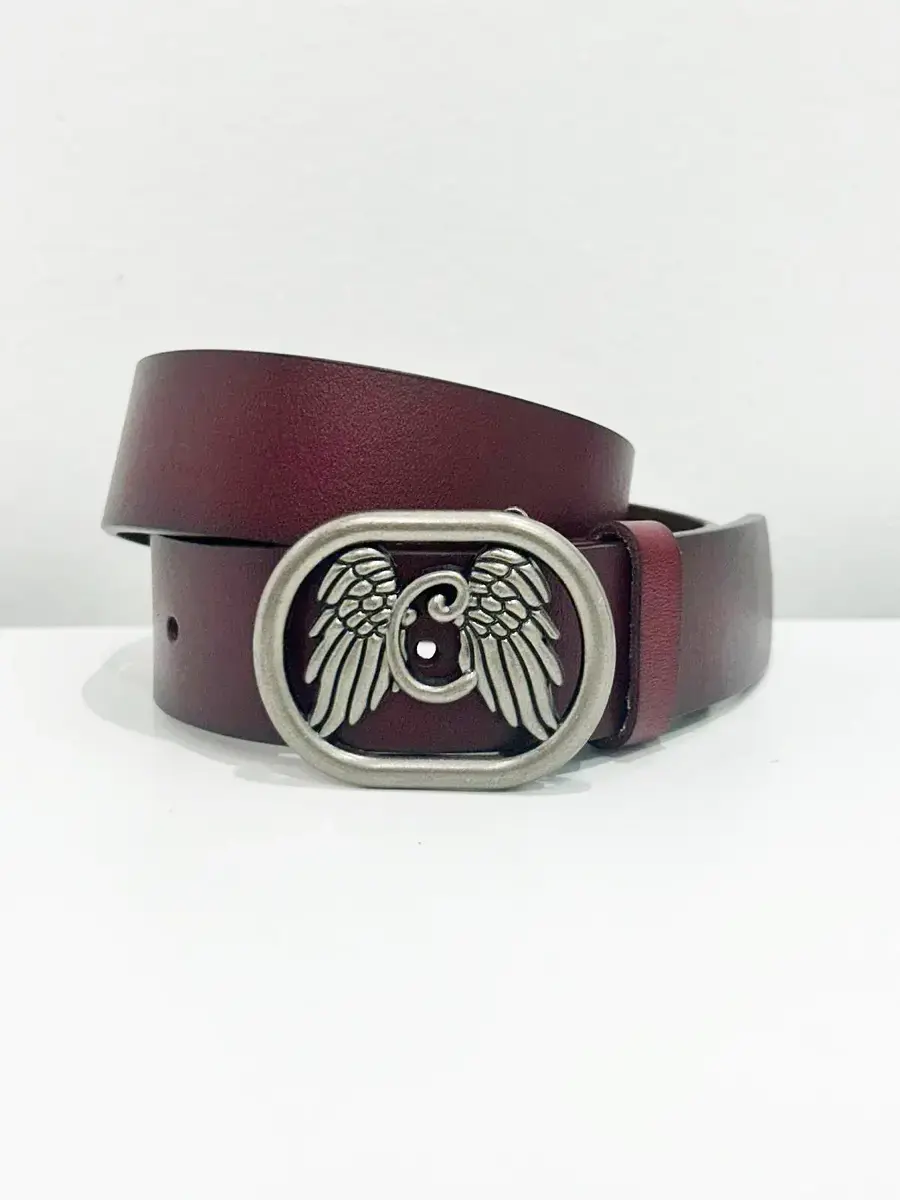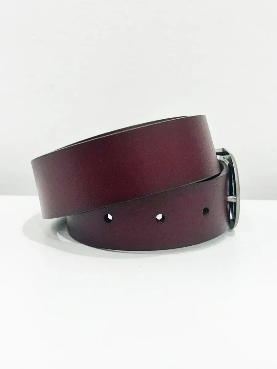 CINTURÓN DE PIEL BURDEOS CON HEBILLA PLATEADA CON LOGO DE LA MARCA.