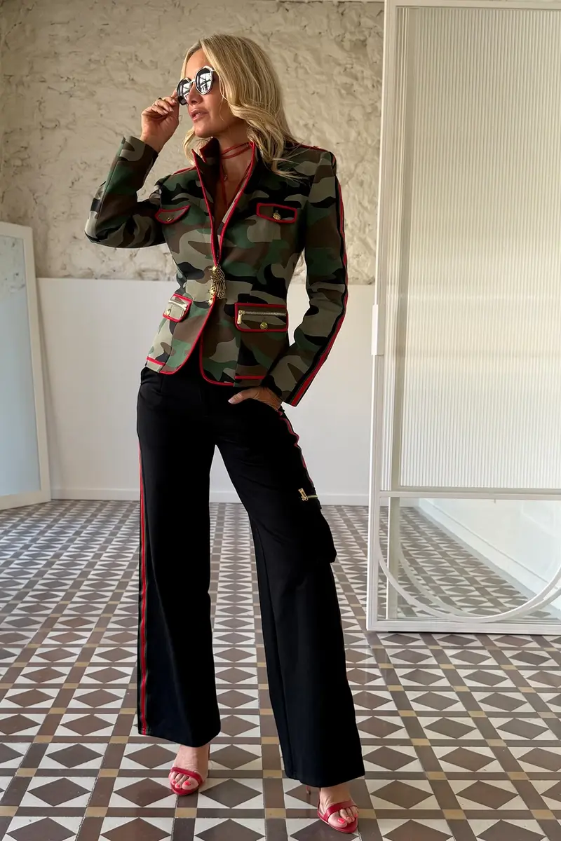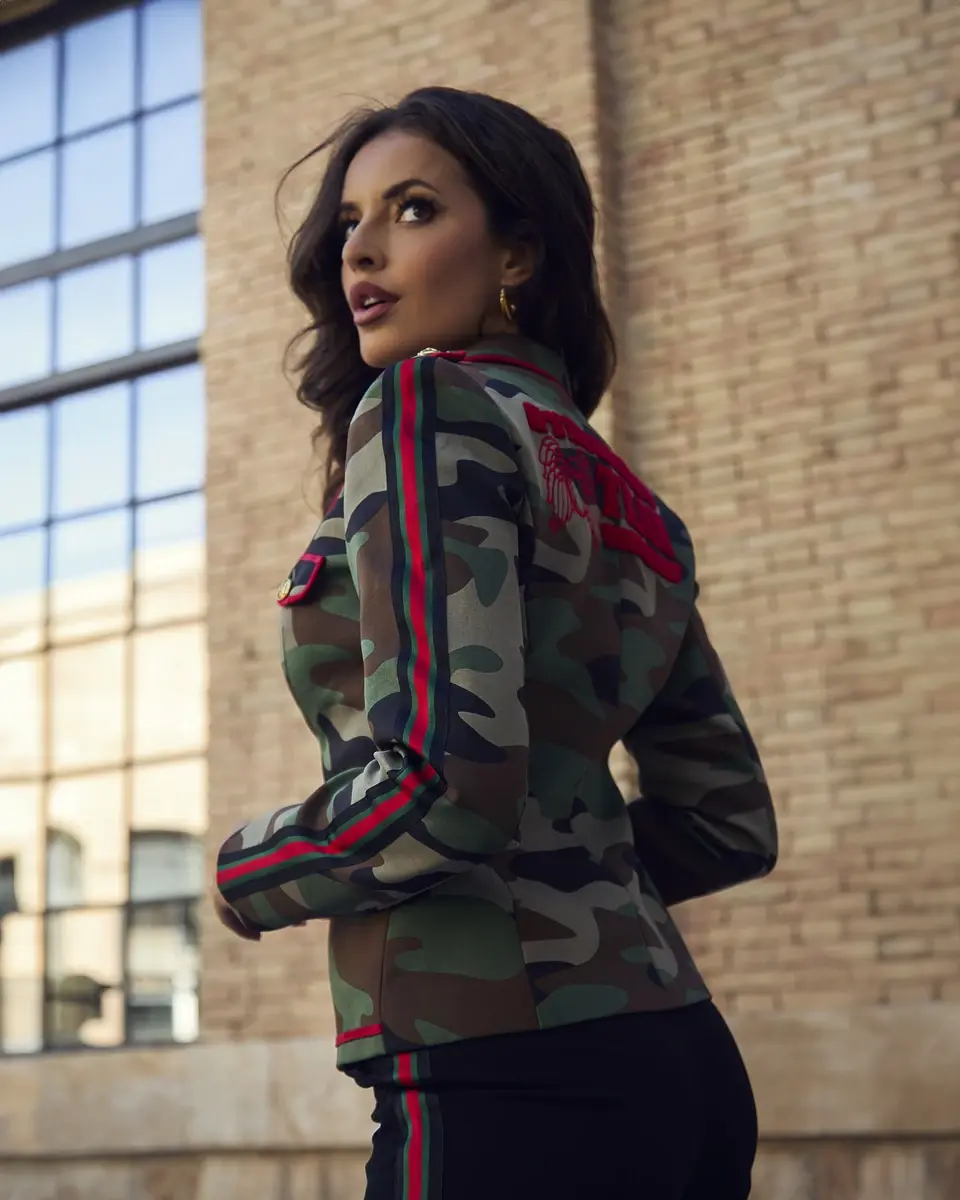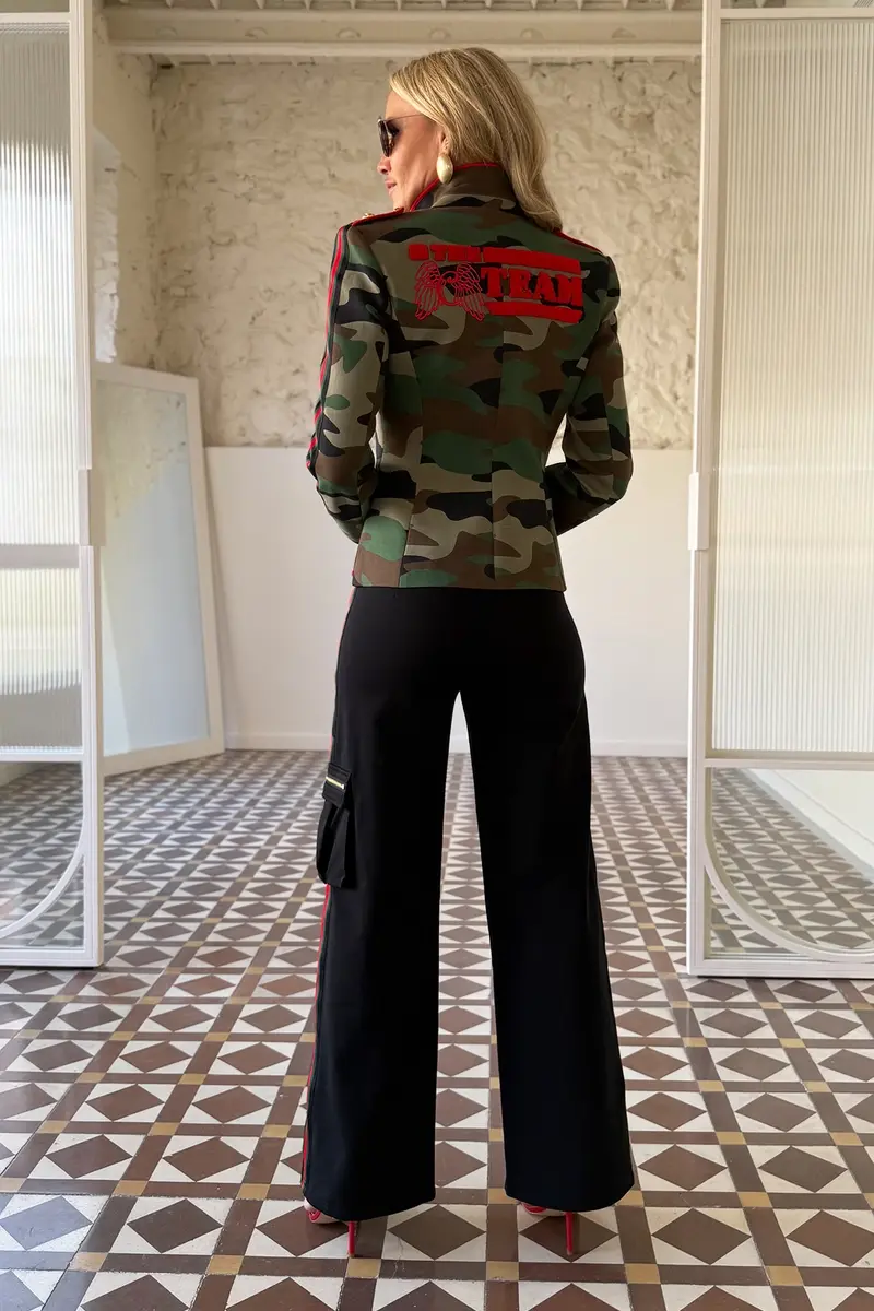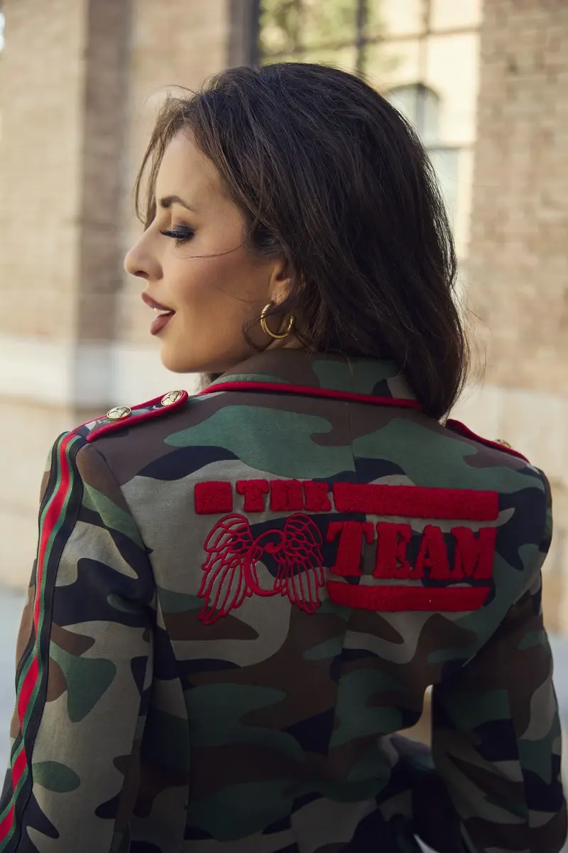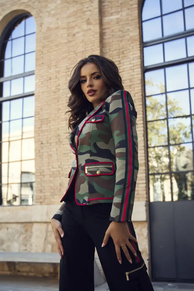 BLAZER DE CAMUFLAJE,CON DETALLE DE BANDAS EN LAS MANGAS,BOTONES DORADOS Y BORDADO CON MOTIVO MILITAR EN ESPALDA.