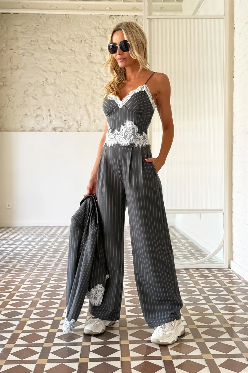 BLUSA CORTA EN COLOR GRIS Y RAYA DIPLOMATICA,ESCOTE PICO Y TIRANTE REGULABLE.EN EL PECHO LLEVA ENCAJE BLANCO.