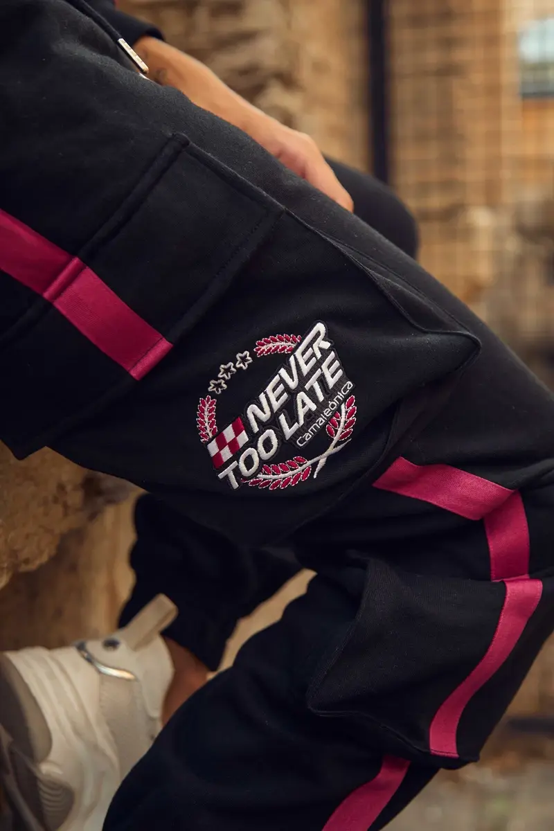 CHAQUETA BOMBER NEGRA CON DETALLES BURDEOS Y BLANCO.EN LA PARTE INTERIOR LLEVA BOLSILLO.