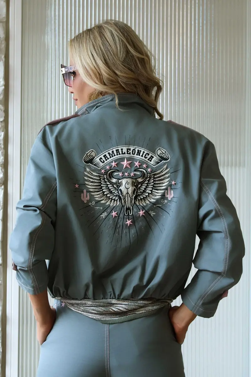 CAZADORA TIPO BOMBER EN COLOR KAKI CON PESPUNTES Y DETALLES EN TONOS ROSAS.PRESENTA GOMA EN LA CINTURA Y HEBILLA EN EL CUELLO.