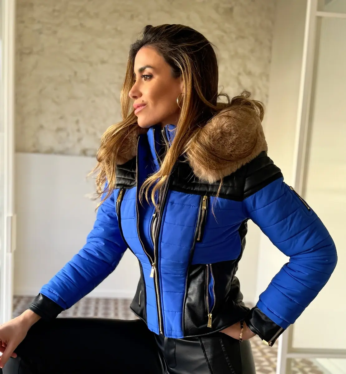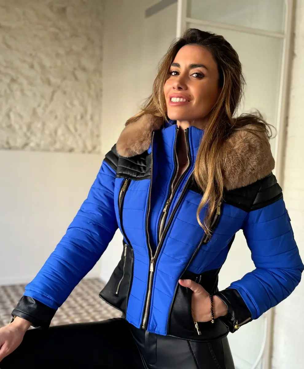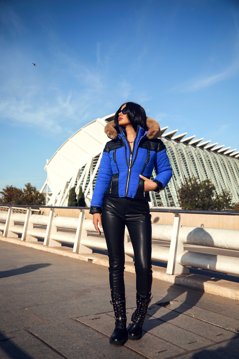 Cazadora de plumas en azul eléctrico,con detalles en ecopiel.Capucha con pelo extraíble.Bolsillos delanteros y doble abotonadura en la parte delantera con cremallera.