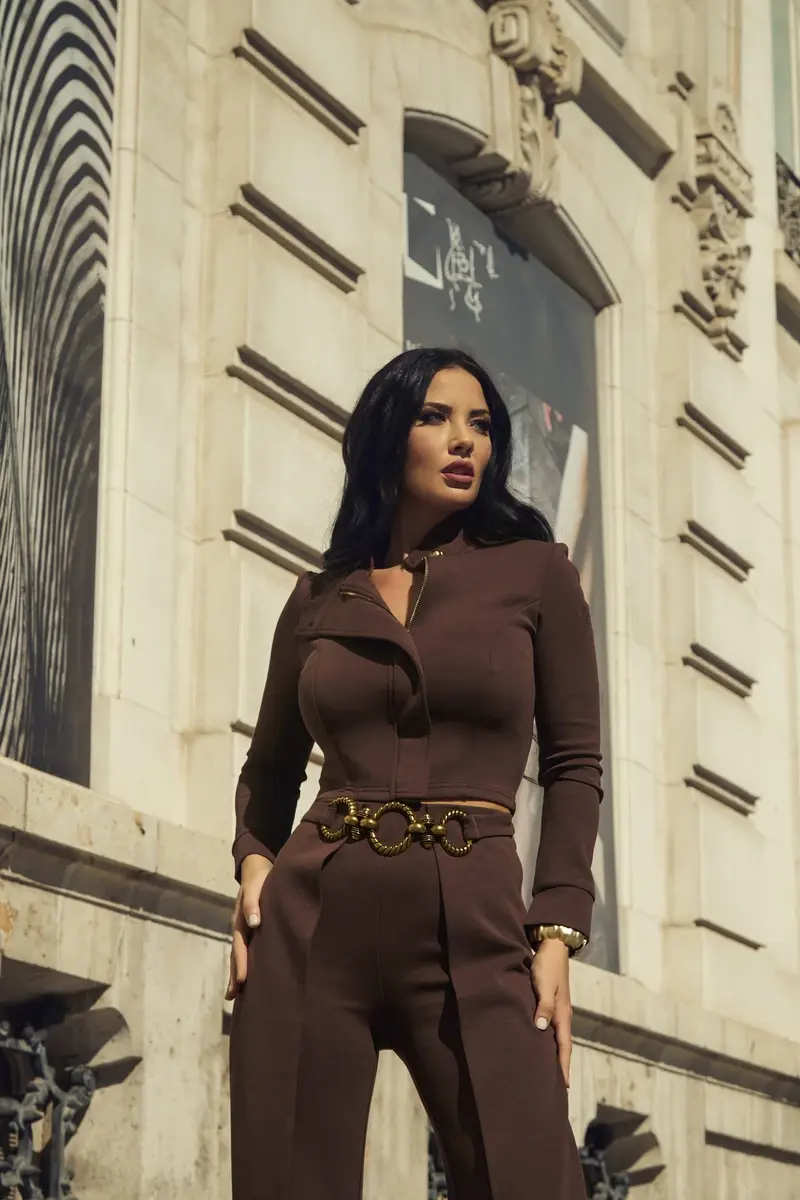 CONJUNTO DE PUNTO DE LYCRA.LA CHAQUETA CORTA CON CREMALLERA Y TAPETA PARA OCULTARLA,DETALLE BOTÓN DORADO.PANTALÓN ANCHO CON CINTURÓN DE AROS DORADOS INCORPORADO Y CAMAL CON EFECTO PAREO.