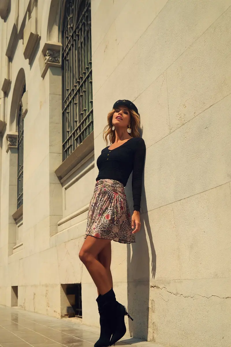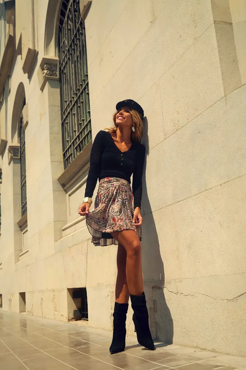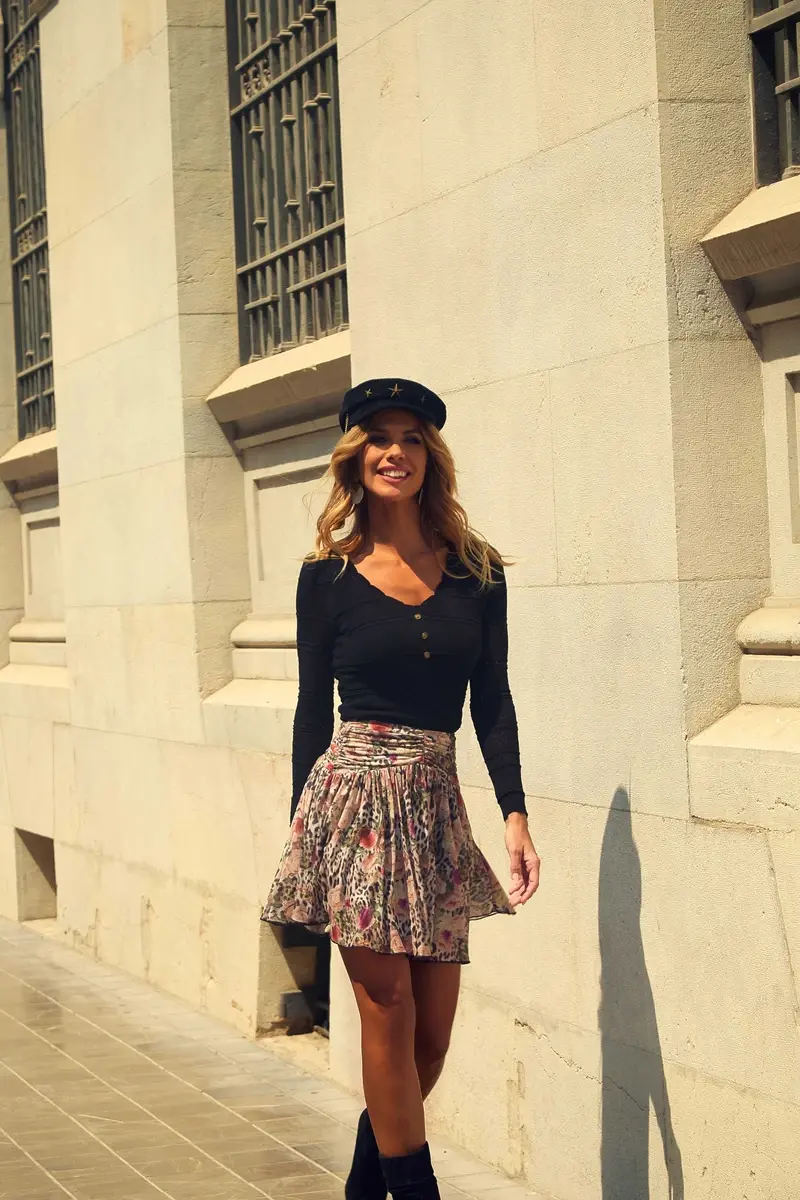 FALDA CORTA DE TUL CON ESTAMPADO DE FLORES Y ANIMAL PRINT.CINTURA FRUNCIDA Y CREMALLERA DORADA EN LA PARTE TRASERA.