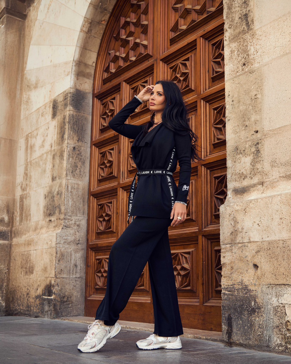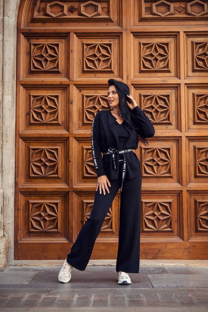 Pantalón palazzo en tejido de punto negro.