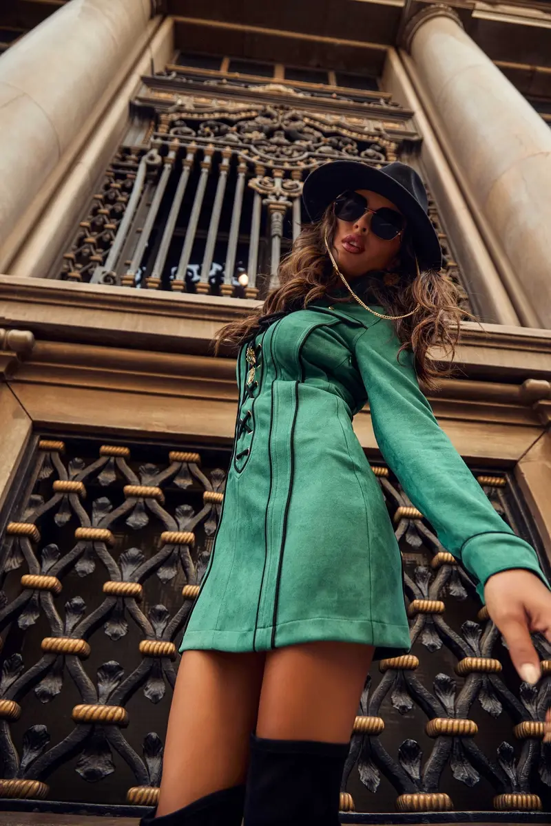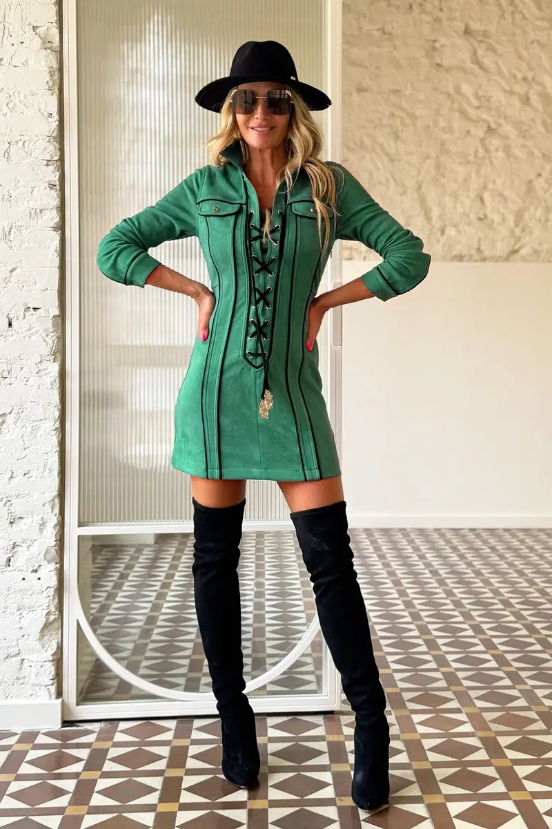 VESTIDO CORTO DE ANTELINA,DE COLOR VERDE Y DETALLES EN NEGRO. CON BOLSILLOS EN LA PARTE DEL PECHO.CREMALLERA INVISIBLE LATERAL.