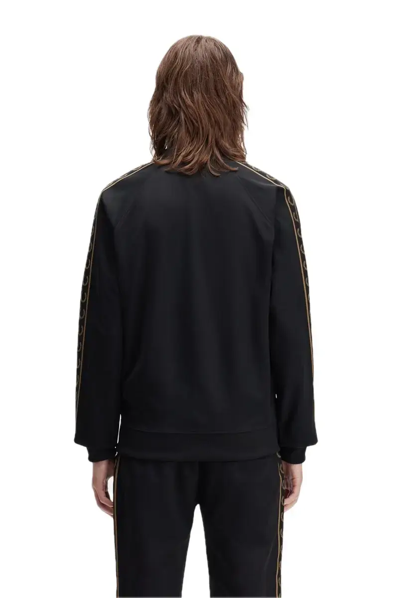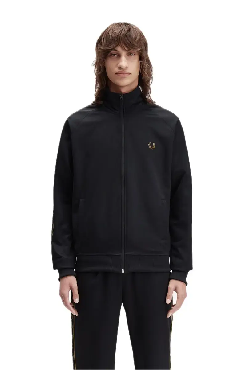 CHAQUETA ABIERTA CON CREMALLERA Y GRANJA EN NEGRO Y DORADO DE FRED PERRY EN EL BRAZO.