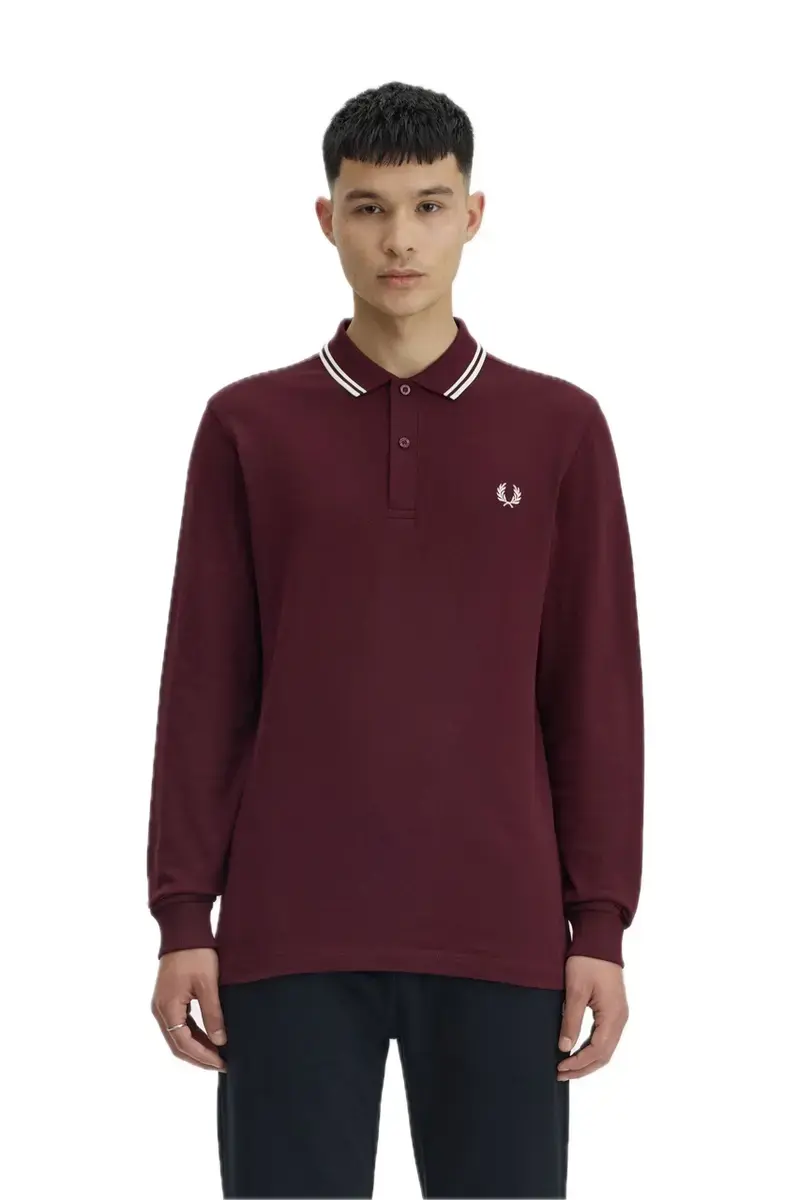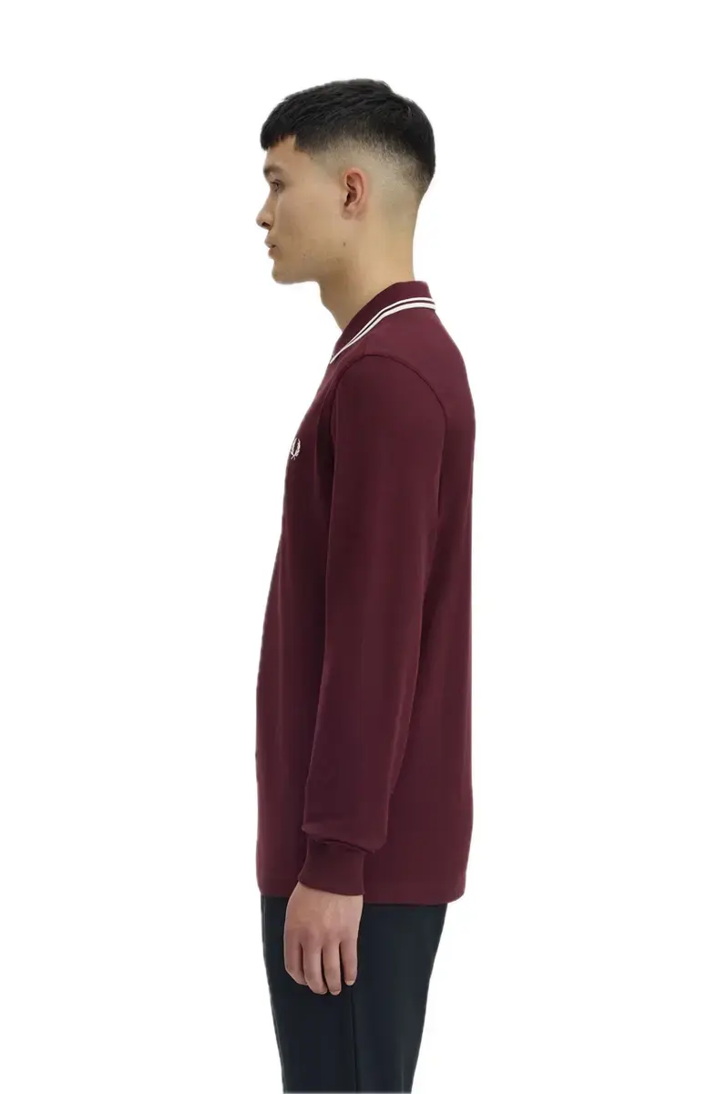 POLO MANGA LARGA BURDEOS,LINEAS EN SOLAPA EN COLOR BLANCO,BORDADO DE FRED PERRY EN EL PECHO Y PUÑO DE CANALÉ.