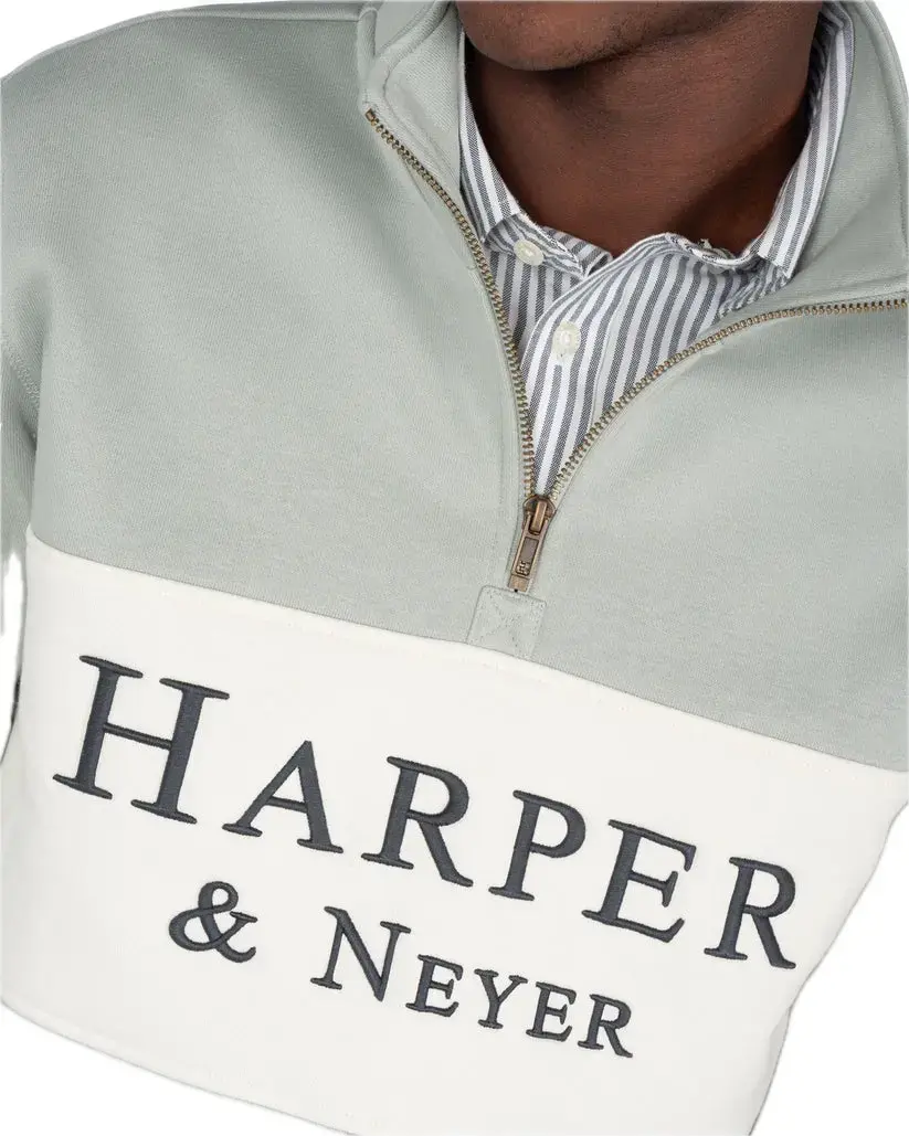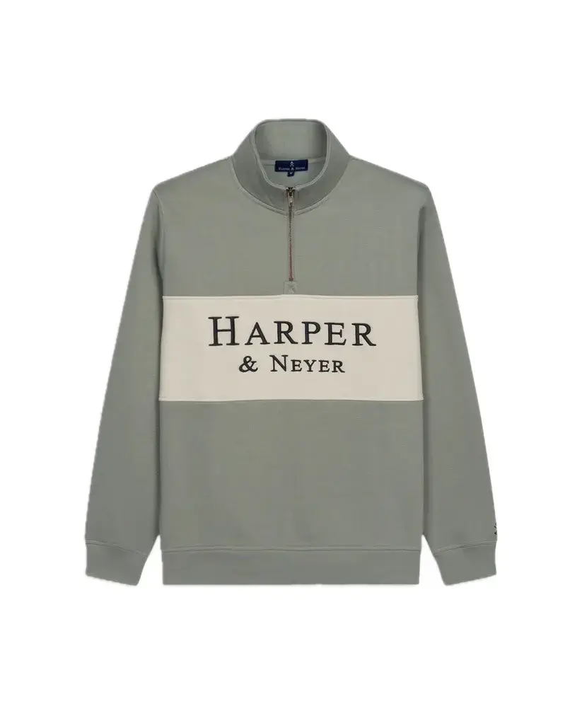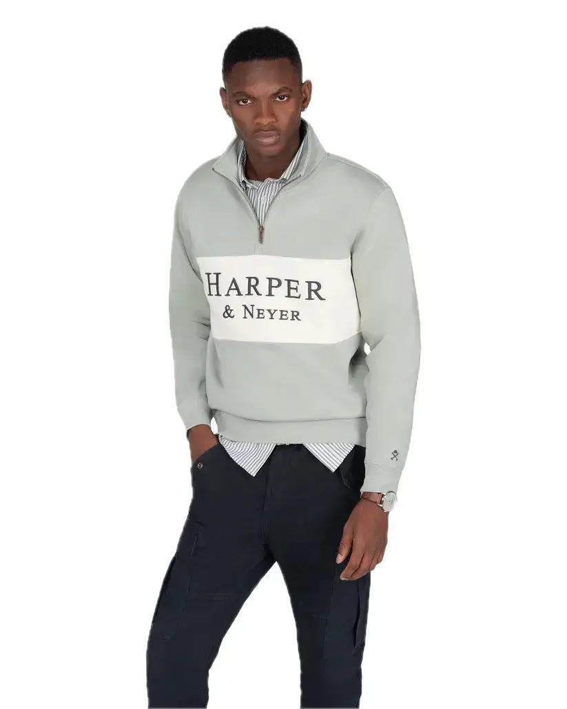 Cuenta con cuello alto,puños y bajo acanalados y diseño rematado con logo «Harper & Neyer» serigrafiado en pecho en color crudo.