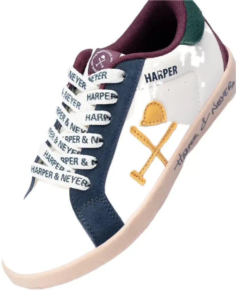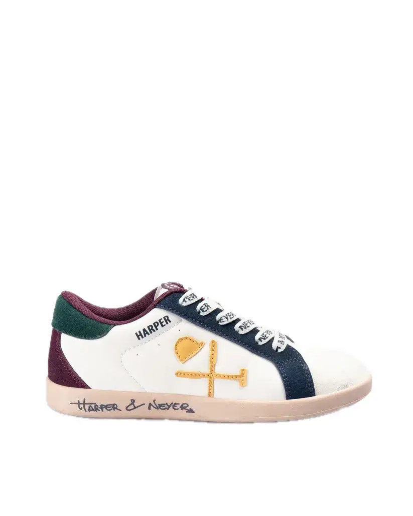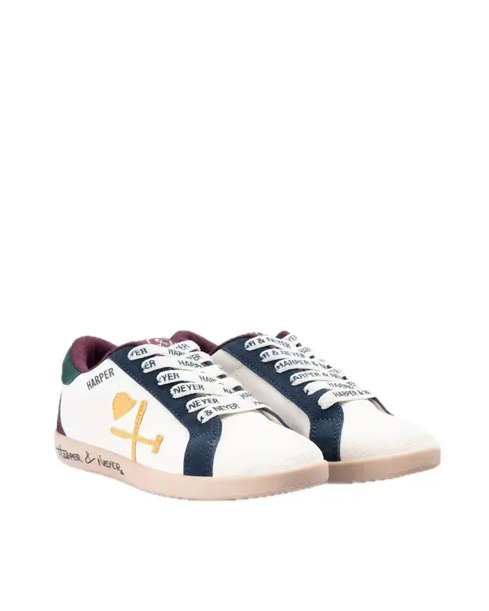 La zapatilla superbowl para niño con su estilo deportivo y diseño robusto,en blanco,combinada en varios colores,logo en amarillo,parte trasera en verde y burdeos con logo en blanco y borro burdeos.