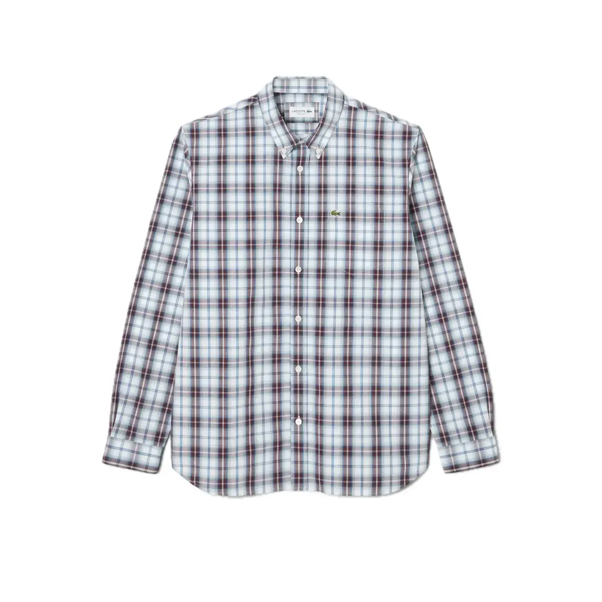 CAMISA DE CUADROS ESCOCESES,EN TONOS BURDEOS Y BLANCOS EN TEJIDO DE ALGODÓN ORGÁNICO,CON PINZAS EN LA PARTE TRASERA Y LLEVA BOLSILLO CON COCODRILO GRABADO.
