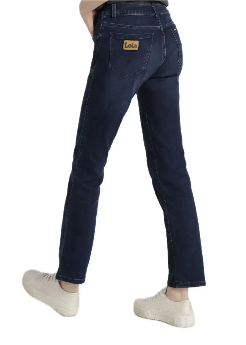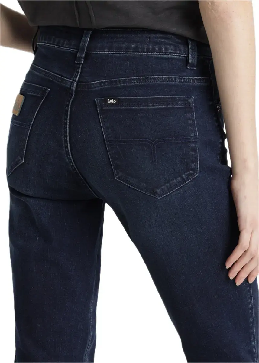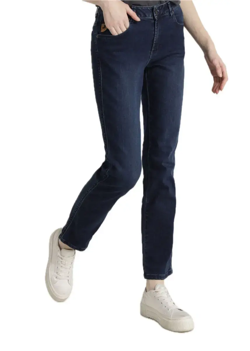 Es un modelo de jeans para mujer de corte recto y tiro bajo,diseñado en un tono azul oscuro.