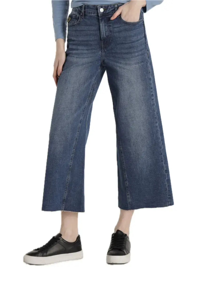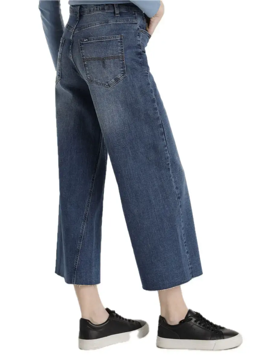 Es un modelo de jeans para mujer con un patrón recto y ancho con un corte cropped,lo que significa que el largo del pantalón llega el tobillo aproximadamente.