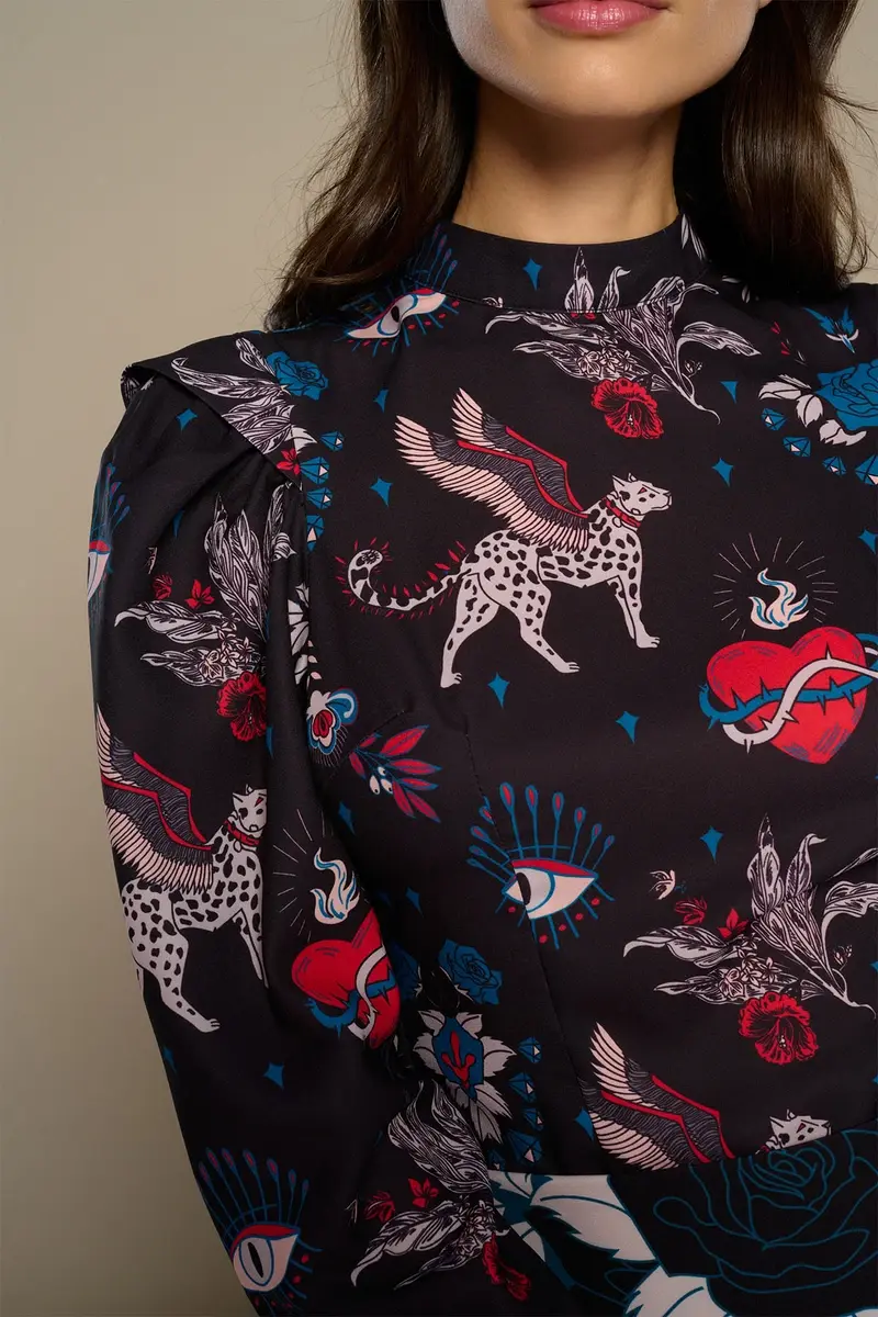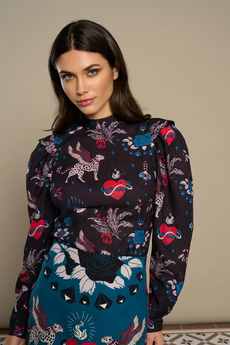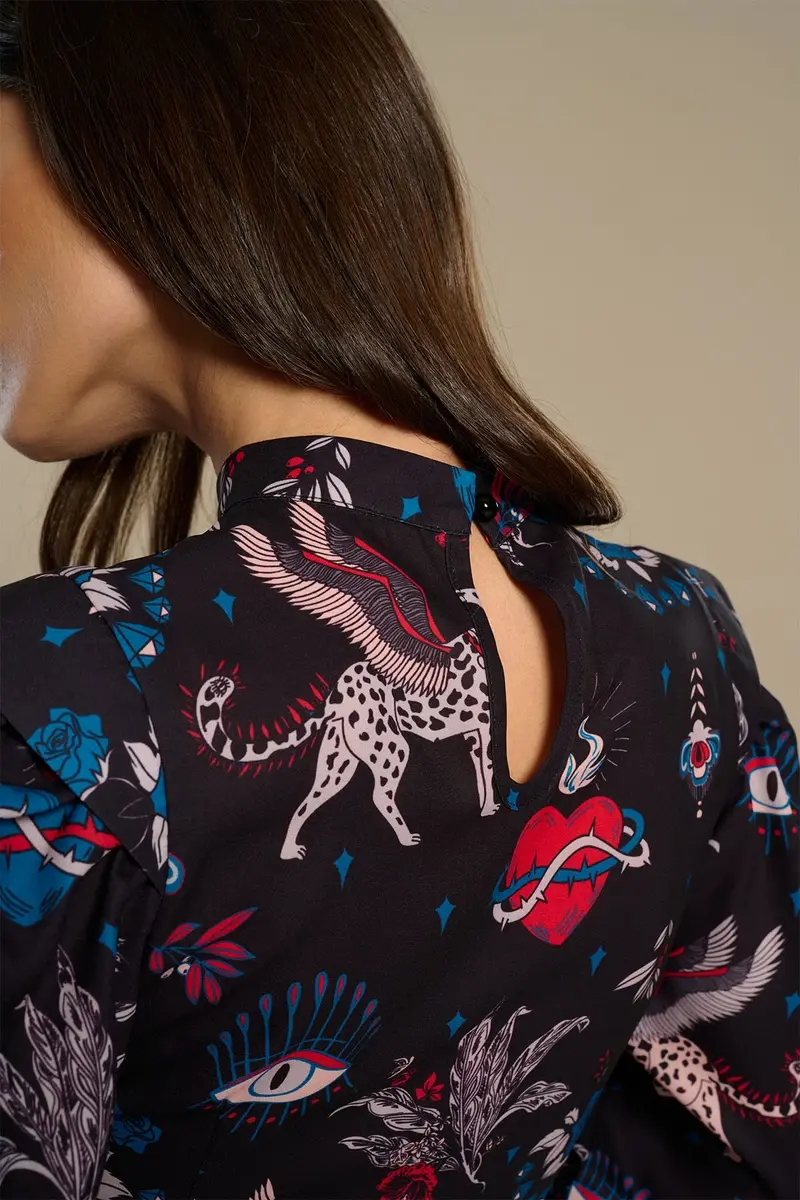 TOP CUELLO PERKINS Y MANGA LARGA,CON ESTAMPADO MISTICO,CERRADO EN LA ESPALDA CON ABERTURA Y BOTÓN.