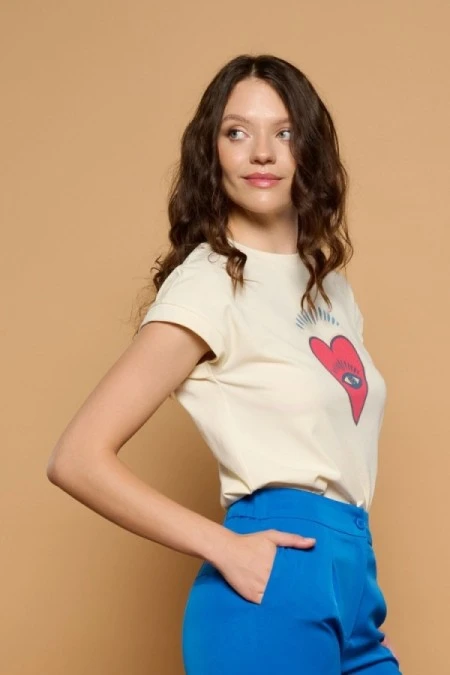TOP MANGA CORTA Y CUELLO REDONDO.CORAZON EN LA PARTE CENTRAL. TEJIDO EN MEZCLA DE ALGODÓN ELÁSTICO.