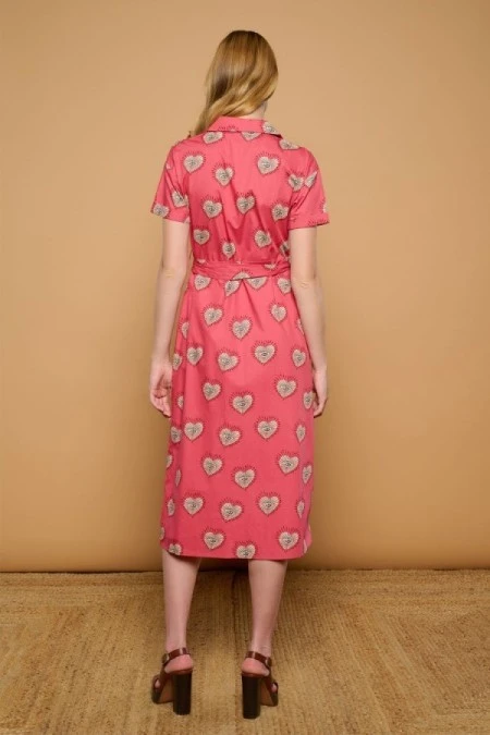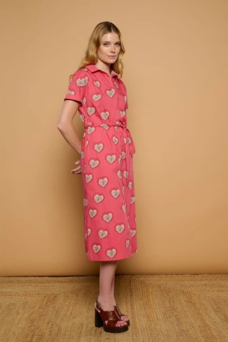 VESTIDO CAMISERO MIDI CON CUELLO SOLAPA Y MANGA CORTA. CINTURÓN PARA AJUSTAR. ESTAMPADO DE CORAZONES.TEJIDO 100% ALGODÓN. CIERRE CON ABOTONADURA CENTRAL.