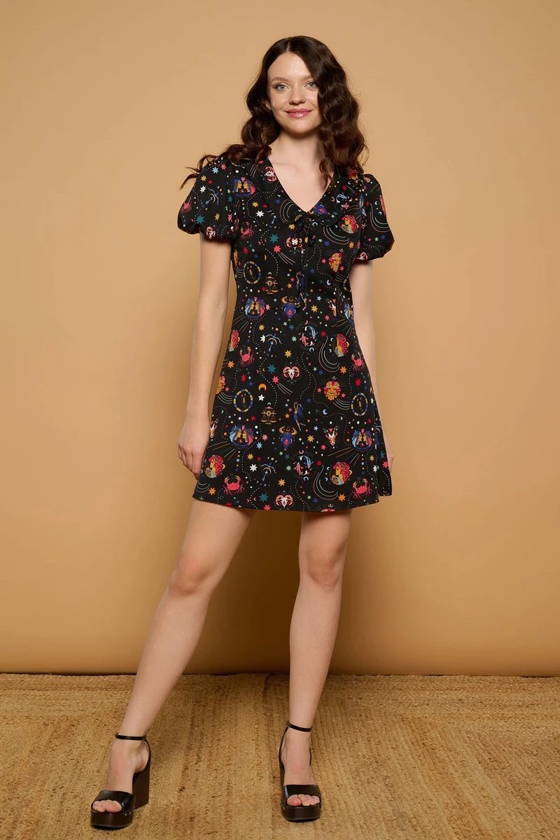 VESTIDO CORTO CON CUELLO BEBÉ. MANGA CORTA ABULLONADA.CORTE EVASÉ Y AJUSTADO A LA CINTURA.CIERRE CON CREMALLERA TRASERA.