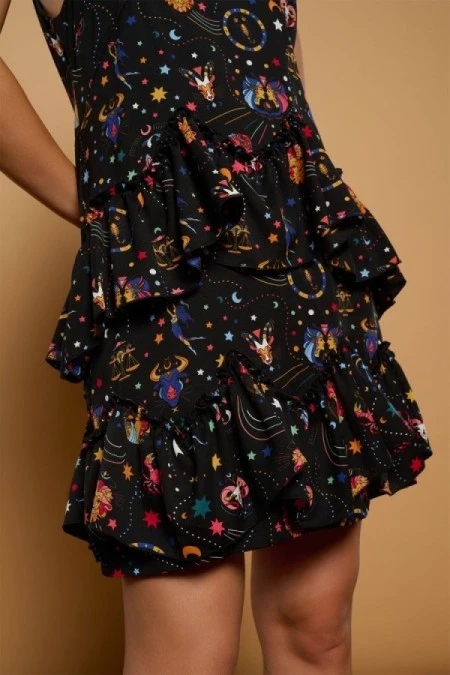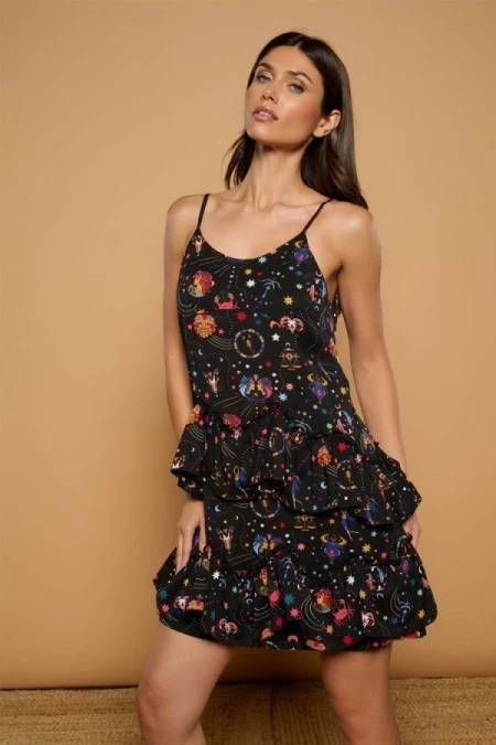 VESTIDO CORTO DE TIRANTE FINO Y ESCOTE REDONDO.FALDA DE VOLANTES.ESTAMPADO MULTICOLOR.