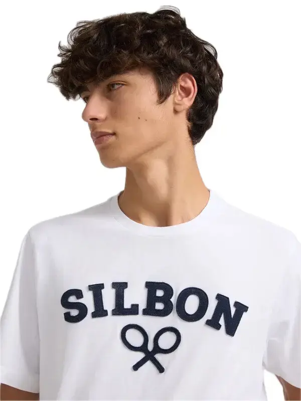 Con corte regular fit.Presenta cuello redondo y cuenta con apliques de tejido dobrepuesto de letras y raquetas en la parte frontal en azul marino.
