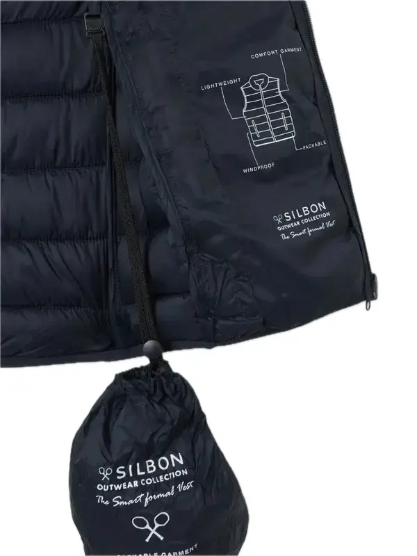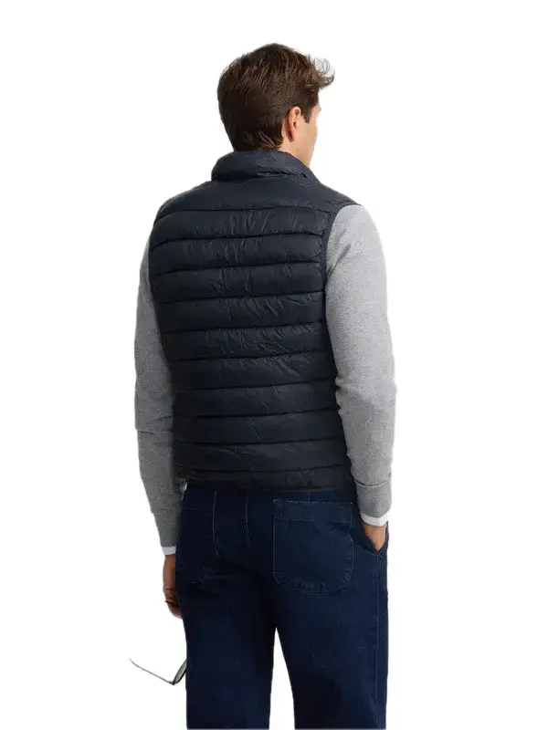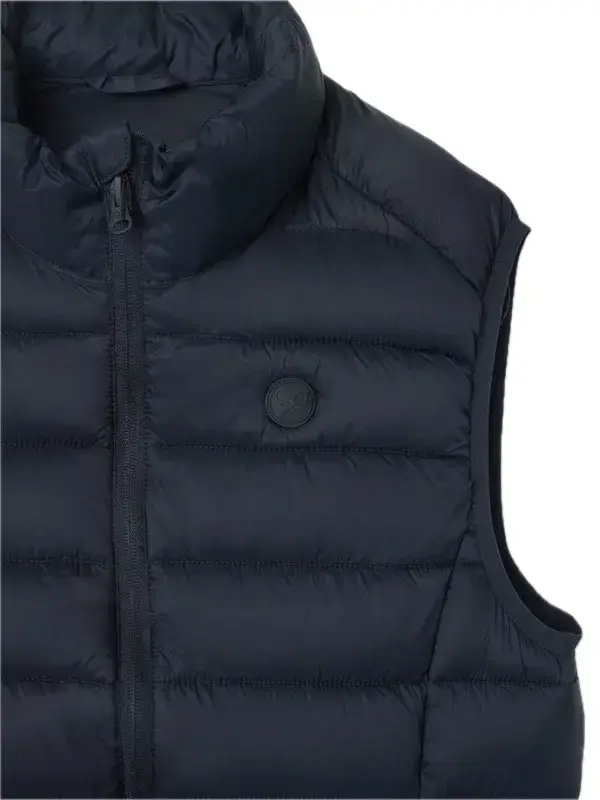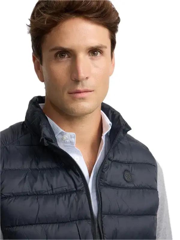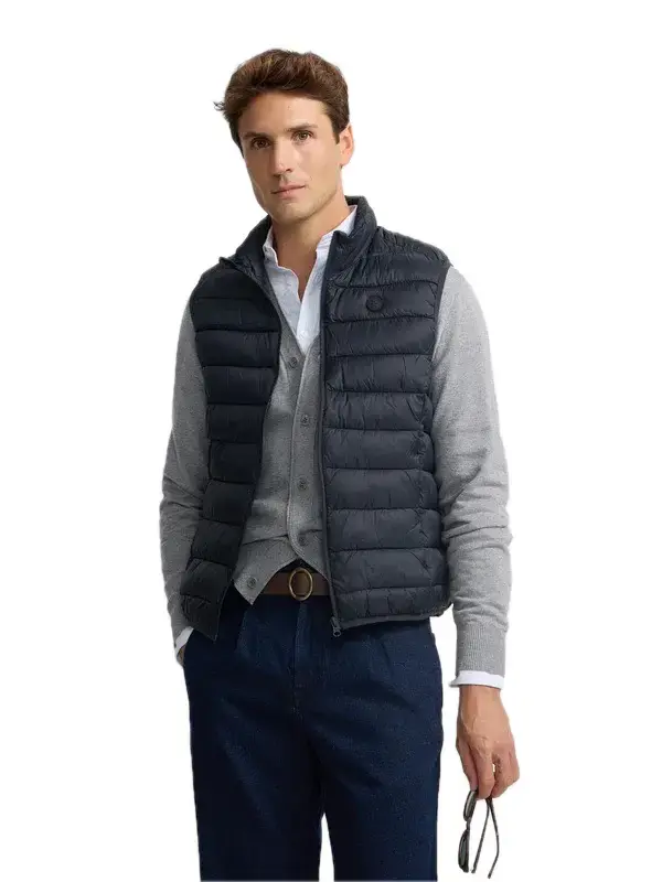 Chaleco ultraligero de corte regular fit,cierre frontal con cremallera,tiradores personalizados y cuello subido.