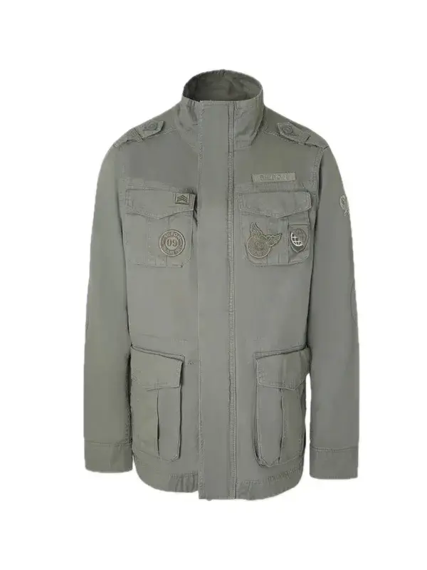 Presenta cuatro bolsillos frontales tipo parche,cierre frontal con cremallera con tapeta oculta y cuello subido.Cuenta con parches,detalle de logo bordado en una de las mangas,cordón interior en la cintura ajustable,bolsillo interior cierre clip.